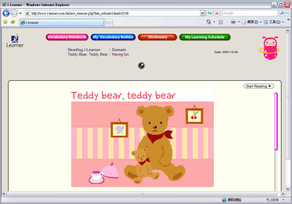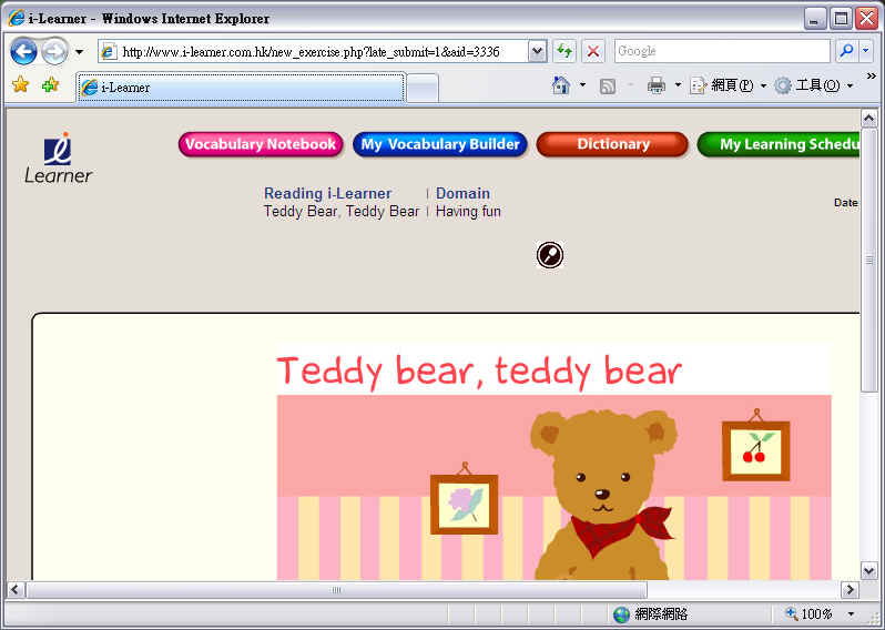 如發現您的電腦螢幕不能把整個 i-Learner 平台的網頁畫面顯示出來,常會需要把畫面往上下左右拉動調整角度才能瀏覽的話 (見圖一),這代表您的螢幕解析度不是 1024 X 768 像素,請將螢幕解析度重新調整至 1024 x 768 像素。 |
