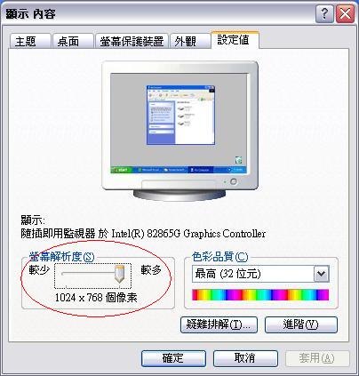 | 2. 按下「設定值」版面,在「螢幕解析度」部份調教至 1024 x 768 像素後按下「確定」。 | |||
